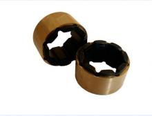 橡膠軸承 用于軸與軸套之間起支撐作用。分銅套橡膠軸承、鐵殼橡膠軸承、軸承條及全橡膠軸承。采用模壓法制造。主要用于船舶軸流泵、深井泵等,作為漿葉、泵葉的支撐體。